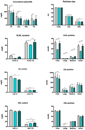 Lipoprotein analysis of serum samples was performed with the Liposcale® test (Biosfer Teslab, Reus, Spain), a 2D diffusion-ordered 1H-NMR spectroscopy-based method, as previously described []. This protocol evaluates lipid concentrations, size and particle number of three different classes of lipoproteins (very-low-density lipoprotein (VLDL), LDL and HDL) as well as the particle number of nine subclasses (large, medium and small VLDL, LDL and HDL). Briefly, 2D 1H-NMR spectra were recorded on a BrukerAvance III 600 spectrometer, operating at a proton frequency of 600 MHz at 310 K (Bruker BioSpin, Rheinstetten, Germany). The methyl signal was surface-fitted with the numbers of functions so that the nine lipoprotein subclasses could be determined. The NMR functions were associated with a given lipoprotein subclass (large, medium and small VLDL, LDL or HDL) according to their NMR size. The mean particle diameter for the subclasses (and estimated ranges) were as follows: large VLDL particles (VLDL-Ps), 75.2 nm (>60 nm); medium VLDL-Ps, 52.1 nm (45–60 nm); small VLDL-Ps, 37.1 nm (35–45 nm); large LDL particles (LDL-Ps), 22.8 nm (22.5–27 nm); medium LDL-Ps, 20.5 nm (20–22.5 nm); small LDL-Ps 18.9 nm (18–20 nm); large HDL particles (HDL-Ps), 10.1 nm (9–13 nm); medium HDL-Ps, 8.7 nm (8.2–9 nm); small HDL-Ps, 7.8 nm (<8.2 nm) in agreement with previous literature [,,]. The particle number of each main lipoprotein fraction was calculated by dividing the lipid volume by the particle volume of a given class. Lipid volumes were determined using common conversion factors to convert concentration units obtained from the partial least-squares models into volume units. Finally, weighted average VLDL, LDL and HDL particle sizes (in nm diameter units) were calculated for each subclass particle by summing the known diameter of each subclass multiplied by its relative percentage of subclass particle number, as estimated from the intensity of its methyl NMR signal [].
