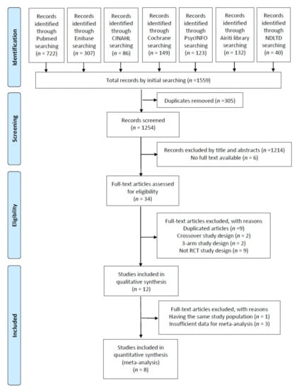 Initially, 1559 articles were obtained using the search strategy. Removing duplicates and screening by the titles and abstracts, we excluded 1519 articles (Figure 1). Subsequently, after full text assessment, 12 studies were deemed eligible for inclusion [15,16,17,18,21,22,28,29,30,31,32,33]. Two publications by Garcia-Gonzalez et al. had the same study population [16,33], and one of that mainly focusing on newborns outcome was excluded [33]. Finally, 11 trials were included in our review (Table 1).