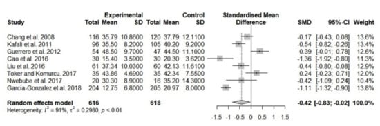 To evaluate the effect of music interventions on anxiety, we pooled eight studies in the meta-analysis. The rest three studies were excluded due to insufficient data [22,30,32]. The result indicated that anxiety levels of participants in the music group (n = 616) significantly decreased compared with those of participants in the control group (n = 618) (SMD, −0.42; 95% CI, −0.83 to −0.02; I2 = 91%; Figure 2). Although the significance remained unchanged only after removing either of Guerrero et al.’s [29] or Toker and Kömürcü’s [18] study, the sensitivity test still showed a trend for anxiety reduction in the music group (Figure S1).
