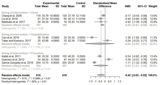 Forest plot of pooled anxiety scores after the intervention, comparing the music group and the control group (Subgroup analysis by the timing of interventions). SD, standard deviation; SMD, standardized mean difference; CI, confidence interval.