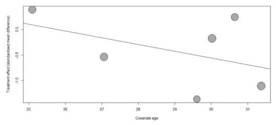Considering the heterogeneity in participants’ characteristics, we performed a subgroup analysis. A subgroup analysis based on the timing of music interventions showed that anxiety was significantly reduced in the group listening to music at home (SMD, −0.28; 95% CI, −0.47 to −0.08; I2 = 0%), but no significant difference was observed in the hospitalization group or the group receiving music during the procedure (Figure 3). Another subgroup analysis based on the music type revealed significant differences when music was provided by the investigator (SMD, −0.83; 95% CI, −1.50 to −0.17; I2 = 74%; Figure S2). Univariate meta-regression revealed that the treatment effect of music on anxiety was nonsignificant when age was used as the effect modifier (p = 0.37; Figure 4). Furthermore, funnel plot and Egger’s test indicated no publication bias (p = 0.38) (Figure S3).