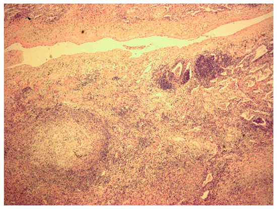 Microscopic findings of video-assisted thoracopscopic surgery biopsy shows granuloma showing a peripheral rim of epithelioid histiocytes surrounding the central necrotic region (hematoxylin-eosin stain, ×40 magnification).