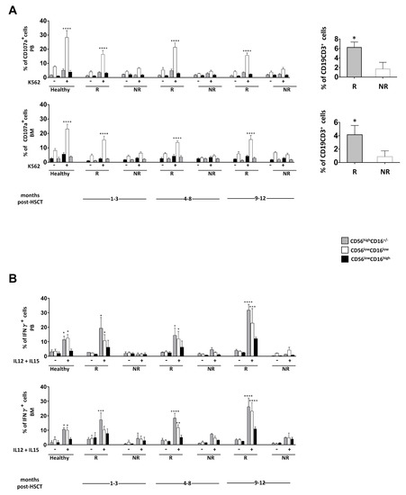 Impact of iCas9 donor T cells on BM and PB CD56lowCD16low NK cell effector functions at different time points after T-cell-depleted HSCT. (A) Cells freshly isolated from BM or PB of paediatric transplanted patients and healthy donors were co-cultured for 3 h with K562 target cells at 1:1 effector/target cells ratio and the degranulation ability of CD56highCD16+/−(grey), CD56lowCD16low (white) and CD56lowCD16high (black) NK cell subsets gated on CD56+CD3− NK cells was assessed by measuring the percentage of CD107a positive cells by flow cytometry. CD107a-positive cells of two groups of patients are shown: R, responder and NR, nonresponder. The bar graphs represent the mean value ± SEM of the percentage of positive cells in BM and PB analysed at different time points after haplo-HSCT. ANOVA test, **** p < 0.0001. (Left panel). Healthy: PB n = 6, BM n = 5; R: PB n = 26, BM n = 19; NR: PB n = 18, BM n = 22. The percentage of iCas9 donor T cells gated on CD3+ T cells of responder (R) (grey) and nonresponder (NR) (white) patients for degranulation is shown. The bar graphs represent the mean value ± SEM (right panel). Unpaired t-test, * p < 0.05. (B) Freshly isolated cells from BM or PB of paediatric transplanted patients and healthy donors were stimulated overnight with IL-12 (25 ng/mL) plus IL-15 (50 ng/mL). The percentage of IFN-γ-positive cells into CD56highCD16+/− (grey), CD56lowCD16low (white) and CD56lowCD16high (black) NK cell subsets gated on CD56+CD3− NK cells was assessed by flow cytometry analysis. The bar graphs represent the mean value ± SEM of the percentage of positive cells analysed. ANOVA test, * p < 0.05; ** p < 0.005; *** p < 0.0002; **** p < 0.0001. IFN-γ positive cells of two groups of patients are shown: R, responder and NR, nonresponder. Healthy: PB n = 5, BM n = 5; R: PB n = 6, BM n = 7; NR: PB n = 9, BM n = 9.