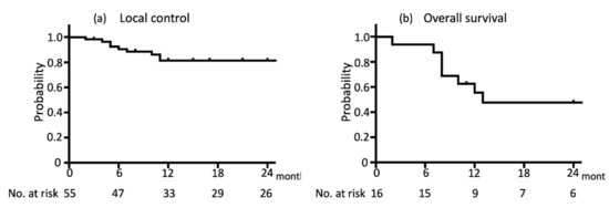 Kaplan–Meier survival estimates for (a) local control (n = 55) and (b) overall survival (n = 16) for CyberKnife-treated in-field neck lymph node (LN) lesions recurring after radiotherapy.