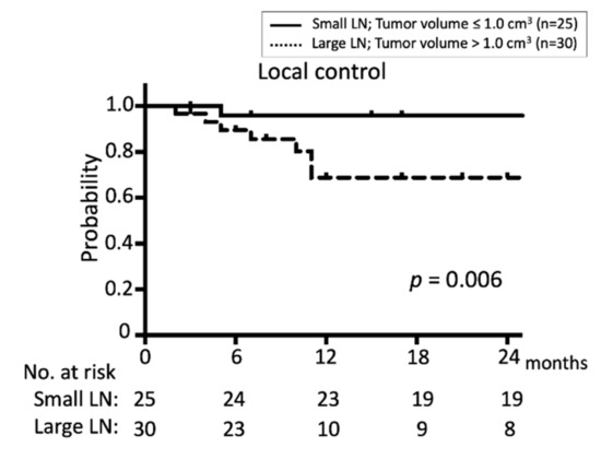 The treatment of small LNs is easier than that of large LNs in terms of dosimetry. In the present study, 25 of 55 lesions had a small volume (≤1.0 cm3). Lesions with target volumes ≤1.0 cm3 had significantly better LC than lesions with target volumes >1.0 cm3, and the two-year LC rates were 95.8% and 65.9%, respectively (p = 0.006), suggesting the therapeutic advantage of small LNs even with re-irradiation. These results imply that the early detection of small neck LN recurrence using advanced modalities, such as high-resolution MRI and FDG-PET/CT with serum tumor markers, will help control in-field LN recurrence. In our study, two small LN of 0.05 cm3 in the same patient were included. One of them remained after chemotherapy and decided to be treated by CyberKnife. The other was close to the swelling LN (12.8 mm in diameter with the maximal standardized uptake value of 5.44). The distance between the small LN and the large LN was 3.6 mm so that the small LN was suspected as metastasis and decided to be treated by CyberKnife.