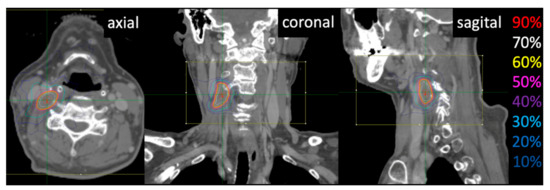Dose distribution for CyberKnife in a representative case. A 58-year-old man with oropharyngeal cancer underwent radiotherapy with 60 Gy in 30 fractions. He showed neck lymph node recurrence after 12 months. He then received 30 Gy in 3 fractions by CyberKnife treatment. He is alive 20 months after CyberKnife treatment. Colored lines show 90% (red), 70% (white), 60% (yellow), 50% (pink), 40% (purple), 30% (cyan), 20% (blue), and 10% (dark blue) isodose curves.