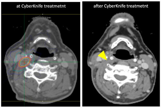 - Yamazaki, H.; Ogita, M.; Himei, K.; Nakamura, S.; Kotsuma, T.; Yoshida, K.; Yoshioka, Y. Carotid blowout syndrome in pharyngeal cancer patients treated by hypofractionated stereotactic re-irradiation using CyberKnife: A multi-institutional matched-cohort analysis. Radiotherapy and oncology. J. Eur. Soc. Ther. Radiol. Oncol. 2015, 115, 67–71. [Google Scholar] [CrossRef] [PubMed]