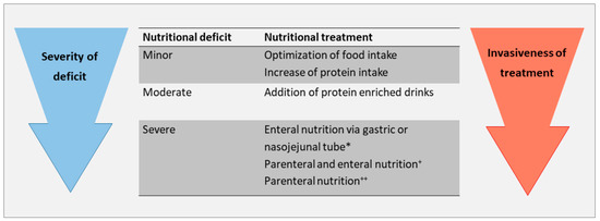 Periods of prolonged fasting should be avoided whenever possible. Risk situations are prolonged waiting time for interventions or surgery, and situations in which a patient is temporarily not able to maintain oral nutrition, e.g., during a stay in the intensive care unit. If oral or enteral feeding is not possible, parenteral nutrition should be considered early [44,45], Figure 1.