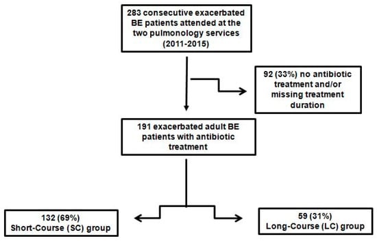 Of the 283 exacerbated patients attended by the participating hospitals with exacerbations of bronchiectasis during the study period, 92 (33%) were excluded from the analysis because they did not receive antibiotic treatment, or the duration of the antibiotic treatment was not recorded. The population therefore comprised 191 patients with bronchiectasis exacerbations, of which most were women (57%; n = 108) and elderly (median age, 72 (63, 79) years). Participants were divided in the short-course group (69%; n = 132) and the long-course group (31%; n = 59) based on their antibiotic treatment duration, as decided by the attending physician (Figure 1).