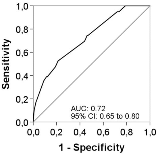 Univariate logistic regression analyses were performed for the main characteristics of patients at baseline and during an acute exacerbation. Several variables were significantly associated with longer courses of antibiotic treatment (Table 4). However, when all significant variables were put into the multivariable model, only three factors remained as independent associated with longer antibiotic treatment. These were the use of LTOT (OR 2.51 (95% CI 1.02 to 6.22)), the presence of a moderate to severe exacerbation (OR 3.31 (95% CI 1.26 to 8.65)), and an etiology of P. aeruginosa confirmed by microbiological isolation (OR 2.89 (95% CI 1.43 to 5.82)). The AUC was 0.73 (95% CI 0.65 to 0.80) for this final model predicting longer antibiotic treatment duration (Figure 2). Internal validation by bootstrapping with 1000 samples demonstrated robust results. All three variables remained significant after bootstrapping, with small 95% CIs around the original coefficients.