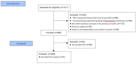 Only eyes with a valuable OCT performed within 5 days before injection of anti-VEGF and on the day of vitrectomy were included. The interval between anti-VEGF injection and vitrectomy was also assessed.