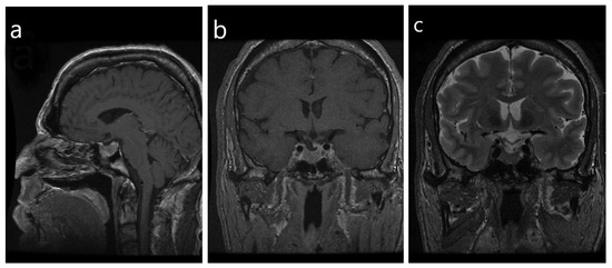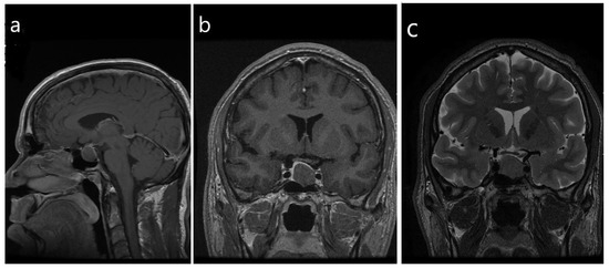 Radiologic imaging of a densely-granulated somatotroph tumor. (a) Note the frontal bossing, prognathism and thickening of the scalp with a “rug sign” that are evident on the sagittal view; (b) in the coronal view the sella is enlarged, with evidence of a macrotumor. The infundibulum is deviated to the left, with an associated focal defect versus a depression in the sellar floor and an inferior herniation of pituitary glandular tissue. There is ptosis of the optic chiasm, with no evidence of mass effect on the chiasm, (c) The tumor does not have a high T2 signal, however, a hypointensity signal is noted within the optic chiasm and proximal cisternal segments of the bilateral optic nerves.