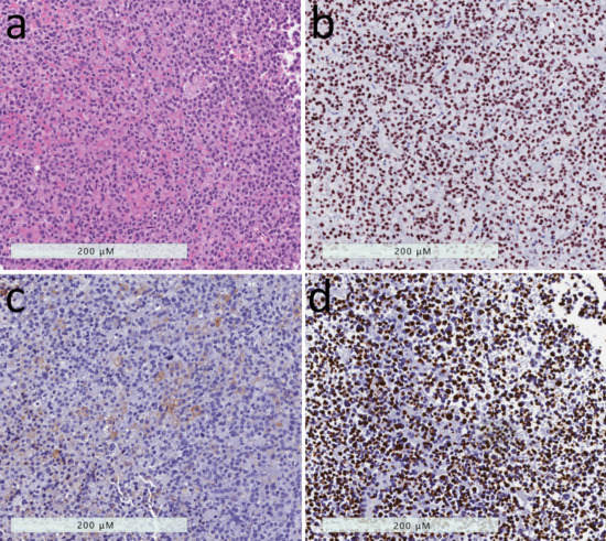 Poorly-differentiated Pit1-lineage tumor. (a) These tumors have variable histology, usually formed of polygonal to spindle-shaped cells. (b) They have strong nuclear Pit1 reactivity. (c) Immunohistochemistry usually reveals variable staining patterns with scattered positivity for GH, PRL, TSH and alpha-subunit of glycoprotein hormones (shown). (d) These tumors usually also have variable expression of estrogen receptor and GATA-3.