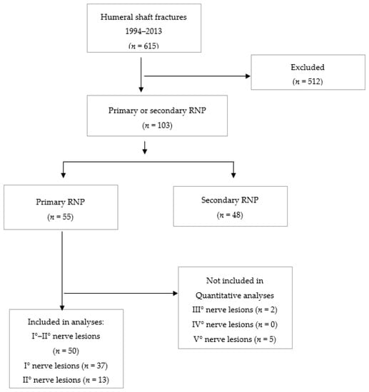 Ostermann RC, Lang NW, Joestl J, Pauzenberger L, Tiefenboeck TM, Platzer P. Fractures of the Humeral Shaft with Primary Radial Nerve Palsy: Do Injury Mechanism, Fracture Type, or Treatment Influence Nerve Recovery? Journal of Clinical Medicine. 2019; 8(11):1969. https://doi.org/10.3390/jcm8111969