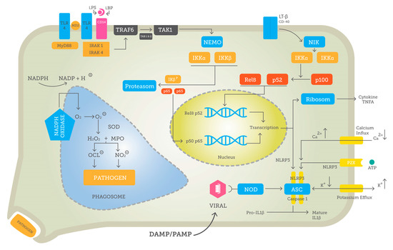 Many downstream signaling pathways end in the activation of the transcription factor NF-κB, with subsequent modulation of its target gene expression. One example is the MyD88 pathway, which begins with MyD88 and its Toll/IL1-receptor (TIR) domain binding to the TIR domain of TLR4 [31]. MyD88 also has a death domain, which is used to bind IL-1 receptor-associated kinases (IRAK) 1 and 4 [32]. This IRAK-1–IRAK-4 complex recruits TNFα receptor-associated factor (TRAF) 6, hereby enabling TRAF6 to enlist serine/threonine kinase TGFβ-activated kinase (TAK) 1 and TAK-binding proteins TAB 1 and 2 [33]. TAK is activated by this process via phosphorylation [34]. Now, converging different pathways, the central protein is made up of three subunits; two catalytic subunits, IKKα and IKKβ, and a regulatory subunit, IKKγ (also named κ-κB essential modulator or NEMO) [35]. Then, an inhibitor of NF-κB kinase (IkB)-complex (IKK) is activated by phosphorylation [35]. IKK phosphorylates IkB, thus exposing it to disassembly via ubiquitination [36]. After the dissolution of IkB, it can no longer inhibit NF-κB. This transcription factor, originally composed of p50, a processing product of p105, and p65 (also called RelA), can translocate to the nucleus [37]. Finally, NF-κB binds to enhancer elements to produce cytokines and adhesion molecules to accelerate inflammation and diapedesis of the effector cells of innate immunity, neutrophils, and macrophages for example [38].