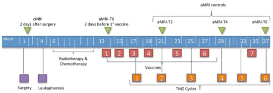 All patients had histologically proven GBM, age ≥ 18 years and ≤ 70 years, neither multifocal nor sub-ependymal diffusion of the tumor, residual tumor volume after surgery < 10 cm3 confirmed by postoperative MRI assessment, Dexamethazone daily dose ≤ 4 mg during the 2 days prior to leukapheresis, Karnofsky performance score (KPS) ≥ 70. After surgery, patients underwent leukapheresis and radiochemotherapy, according to the Stupp protocol [10]. DC were loaded with whole tumor lysate and produced under Good Manufacturing Practices (GMP) conditions [12]. The first 4 vaccinations with tumor lysate loaded DC were performed every two weeks, from week 9 to 15. After the fourth vaccine, MRI was performed. Vaccinations 5 and 6 were spaced one month (week 19 and 23, respectively). The last vaccine dose (the 7th) was on week 31. The 1st, 5th, 6th and 7th vaccines contained 10 million DC; the 2nd, 3rd and 4th vaccines 5 million DC. Adjuvant TMZ started immediately after 3rd vaccination and continued for 6 cycles.