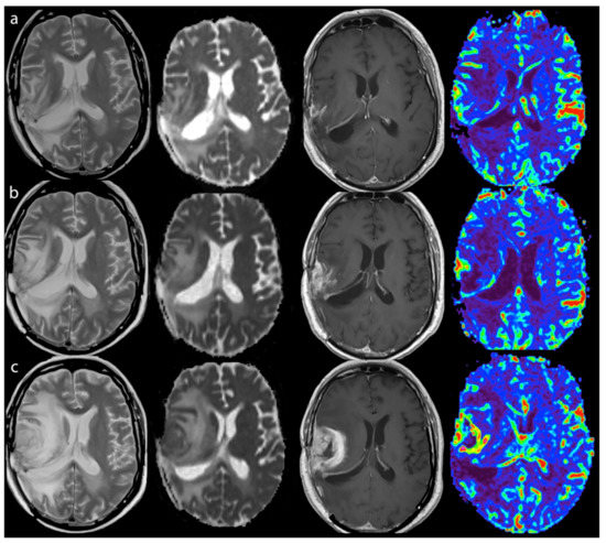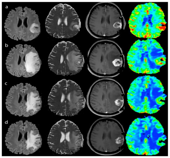 - Gasparetto, E.L.; Pawlak, M.A.; Patel, S.H.; Huse, J.; Woo, J.H.; Krejza, J.; Rosenfeld, M.R.; O’Rourke, D.M.; Lustig, R.; Melhem, E.R.; et al. Posttreatment recurrence of malignant brain neoplasm: Accuracy of relative cerebral blood volume fraction in discriminating low from high malignant histologic volume fraction. Radiology 2009, 250, 887–896. [Google Scholar] [CrossRef] [PubMed]