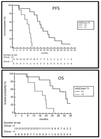 Multivariate analysis using parameters showing statistically significant differences in univariate analysis confirmed that basal rADCmin was the only independent variable affecting both PFS (Exp(b) 13.4 p = 0.001) and OS (Exp(b) 6.47, p = 0.002) (Figure 4).