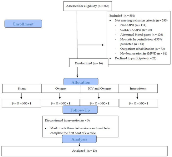 Five hundred fifty-two subjects took part in a regular rehabilitation program after an initial assessment. Of the screened patients, 530 did not meet the inclusion criteria, and 22 declined to participate (Figure 2). Sixteen patients volunteered to participate. Thirteen patients completed the four exercise settings. Three patients withdrew informed consent as the mask made them feel anxious and unable to complete the first bout of exercise. Baseline characteristics of the 13 patients (nine women) who completed all four tests are outlined in Table 1. Patients generally had severe airflow obstruction, severe static hyperinflation, and EID during the 6MWD (lowest SpO2 during 6MWT: 82.5 ± 5.1%).