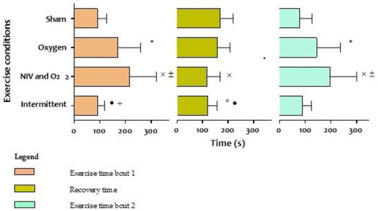 Results of walking time bout 1 and 2 and time till recovery in four tests with different ventilator settings. Statistical significant differences (p < 0,05); * = sham vs. oxygen, ˟ = sham vs. NIV and O2, ° = sham vs. intermittent, ± = oxygen vs. NIV and O2, • = oxygen vs. intermittent, ÷ = NIV and O2 vs. intermittent; Abbreviations: NIV = non-invasive ventilation, O2 = oxygen, s = seconds.