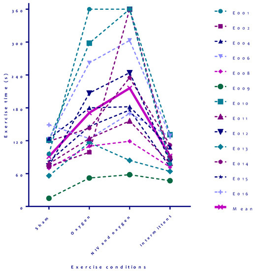 Strengths of this study are the standardized and highly controlled laboratory conditions, the inclusion of a sham setting and blinding of the patient for the setting used. The study also has limitations. Although, theoretically, CPAP is not a real ventilation mode, it might reduce dyspnea and increase exercise tolerance in COPD patients by reducing the DH-associated increased inspiratory threshold load on the inspiratory muscles through counterbalancing PEEPi [39,40]. The use of CPAP might also improve ventilation/perfusion in patients with COPD and hyperinflation Nevertheless, this ‘’sham’’ setting was provided to assure that patients remained blinded to the intervention being applied, and the pressure of 2 cm H2O should be enough to overcome the pressure gradients in the tube and mask. Second, three patients (19%) dropped out because of NIV-intolerance. This rate is comparable to other NIV studies [12,15]. Third, although the different tests were done in a consecutive clockwise rotation scheme with a different starting test setting, no real randomization was done. Because this study was not randomized, we used GEE for all available data to correct for this (data not presented), which did not influence the results. Fourth, we limited the exercise time with a maximum of six minutes for the treadmill tests, which potentially could influence exercise time interpretation. Of the 104 exercise bouts performed in total, only four of them reached the six minutes limit. Hence, we believe this effect is negligible. Given that one of these bouts was in the oxygen setting and three in the NIV/oxygen setting, the influence would be towards an underestimation of the intervention effect. Fifth, we did not study the effects of NIV without oxygen supplementation in our cohort, and therefore, we cannot draw conclusions related to an NIV only effect. Sixth, a resting Vt of 800 ml is relatively high, especially in COPD patients (Table 2). The Vt we documented is measured by the ventilator. However, non-invasive ventilators do not measure tidal volume directly but give an estimation through a built-in software [41]. We mainly used the Vt to evaluate the different test settings. Lastly, we studied a small sample size, and larger studies regarding this topic are needed to establish the effects of NIV in addition to oxygen in this population.