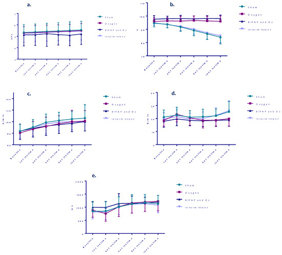 Isotime results on PaCO2, SpO2, heart rate, breathing frequency and tidal volume of different settings during bout 1 of all patients. (a) PaCO2 test 1, (b) SpO2 test 1, (c) Heart rate test 1, (d) Breathing frequency test 1, (e) Tidal volume test 1.