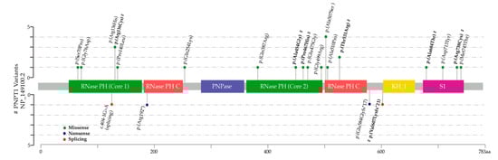 - Alodaib, A.; Sobreira, N.; Gold, W.A.; Riley, L.G.; Van Bergen, N.J.; Wilson, M.J.; Bennetts, B.; Thorburn, D.R.; Boehm, C.; Christodoulou, J. Whole-exome sequencing identifies novel variants in PNPT1 causing oxidative phosphorylation defects and severe multisystem disease. Eur. J. Hum. Genet. 2016, 25, 79. [Google Scholar] [CrossRef]
