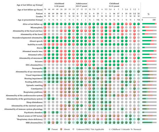 Clinical symptoms using Human Phenotype Ontology (HPO) terminology of patients with bi-allelic PNPT1 variants (n = 24). Green indicates a present phenotype, red indicates an absent phenotype, and gray is unknown or not applicable. * Respiratory chain deficiencies refer to reported reductions in oxidative phosphorylation (OXPHOS) enzyme activity measured by spectrophotometric analysis in any tissue. Neonatal (0–28 days), infant (28 days–1 year), and childhood (>1 year).