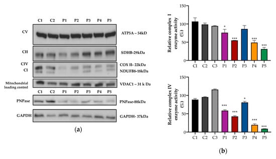 In the fibroblasts, there was a reduction of the mitochondrial complex IV COX II subunit and the complex I NDUFB8 subunit in patients P1–4, although the levels of other OXPHOS subunits were normal (Figure 4a). The activities of complex I and complex IV were determined using a dipstick assay. Compared to the control means, there was a relatively mild reduction in complex I by 20% (P1), 45% (P2), 50% (P4), and a modest reduction in complex IV by 40% (P1), 57% (P2), 20% (P3), and 80% (P4) (Figure 4b). P5 was a previously reported patient with PNPT1 variants [] and was used as a positive control.