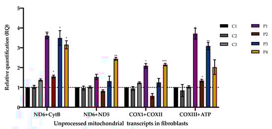 Unprocessed polycistronic mitochondrial transcripts in fibroblasts measured by qPCR. Mean and variation (SEM) between three independent experiments are shown (*** p < 0.001, ** p < 0.002, * p < 0.033).