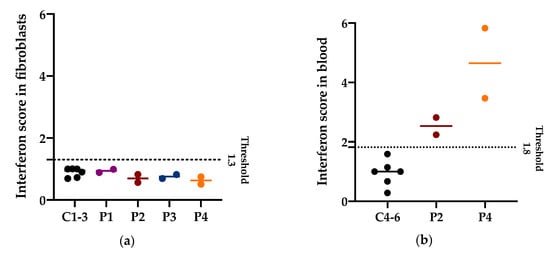 Interferon (IFN) score in fibroblasts and in blood. (a) Median and individual values of the IFN score in fibroblasts of three controls and patients with PNPT1 variants (P1–4) from two independent experiments. The IFN score threshold of 1.3 corresponds to the mean IFN score of controls + 2SD. Higher values are considered positive. (b) Median and individual values of the IFN score in blood of three controls and patients with PNPT1 variants (P2 and P4) from two independent experiments. The IFN score threshold of 1.8 corresponds to the mean IFN score of controls + 2SD. Higher values are considered positive.