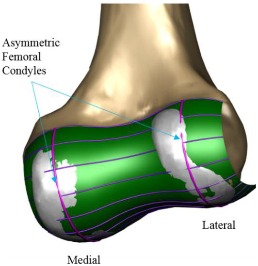 A patient-specific TKA was developed using an existing 3D knee-joint model and the computed tomography (CT) and magnetic resonance imaging (MRI) of a healthy 36-year-old male with a normal knee condition (mechanical femoral tibial angle: varus 1°) [21,22,23,24,25]. The patient-specific TKA model was designed with actual anatomical geometries (Figure 1). CT and MRI were performed using a 64-channel CT scanner (Somatom Sensation 64; Siemens Healthcare; Erlangen, Germany) and a 3T MRI system (Discovery MR750w; GE Healthcare; Chicago, IL, United States), respectively. To develop the 3D model, the 3D reconstruction of the lower extremity was initially performed by segmenting CT and MRI images using Mimics 17.0 (Materialise Ltd., Leuven, Belgium), and combining the positional alignment from each 3D model using Rapidform (3D Systems Korea Inc., Seoul, Korea) [26]. The design procedure of the femoral component was similar to that of our previous patient-specific TKA, and it is briefly described in [17]. The femoral and tibial components were developed using the Unigraphics NX software (Version 7.0; Siemens PLM Software, Torrance, CA, USA). Three patient-specific “J” curves for the trochlear grooves and the medial and lateral condyles from the normal articular anatomy were developed. On the tibial plateau, the outline of the patient’s tibia defines the tibial component geometry. As mentioned previously, the articular geometry of a patient-specific tibial insert design is derived from the femoral component [7,15]. Therefore, the articular conformity of the initial tibial insert was derived from the femoral component.