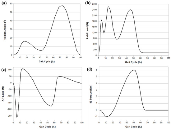Gait cycle input function for the finite-element (FE) model: (a) flexion angle; (b) axial load, (c) anterior/posterior (AP) load; (d) internal/external (IE) torque.