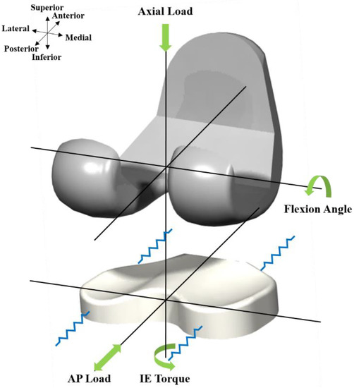 The tibial insert dimensions for the model were parameterized using eight geometric variables associated with the medial and lateral tibial components (Figure 2). An upper and lower limit for each design variable was determined from the literature [29,30]. The loading and kinematic conditions obtained from experimental studies were used in the FE simulation (Figure 3). The knee simulator model comprises a simulated soft tissue with four springs and a spring gap representing anatomical laxity (Figure 4); the four springs constrain the tibial insert in anterior/posterior (AP) translation and internal/external (IE) rotation. The femoral component and tibial insert are tested with the input profiles of an AP load and IE torque applied to the insert, whereas a flexion-extension angle and an axial force are applied to the femoral component. The axial load, AP translation, and IE rotation are force controlled, whereas the flexion is displacement controlled. The femoral component is constrained in IE, medial-lateral (ML), and AP, and it is free to translate in the inferior-superior (IS) direction to rotate about the frontal and transverse axes to represent varus-valgus (VV) rotation and flexion-extension, respectively. The axial load application is offset towards the medial condyle to reproduce the 60:40 experimental conditions. The distal surface of the tibial insert is supported in the IS direction that is representative of the bonded contact with a rigid tibial tray. The tibial insert is allowed to translate in the AP direction and rotate about a fixed vertical axis located at the center of the tibial condyles to simulate IE rotation. The distal surface of the tibial insert is supported in the IS direction; the insert tilt is constrained; the VV and ML degrees of freedom are unconstrained. The center of rotation for the FE model is directly defined between the medial and lateral condyles. The AP spring translational resistance is 10.4 N/mm, and the IE rotational resistance is 0.30 Nm/deg, which are similar to the experiments.
