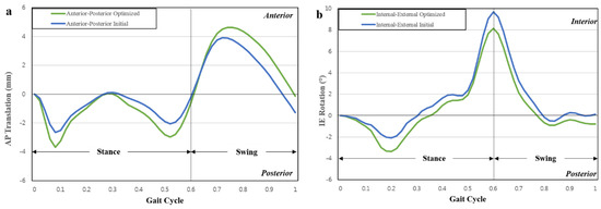 Comparison of kinematics of initial and optimized conformities in customized posterior-stabilized total knee arthroplasty (PS-TKA) under the gait cycle condition: (a) AP translation in 0 and 5 million cycles; (b) IE rotation in 5 million cycles.