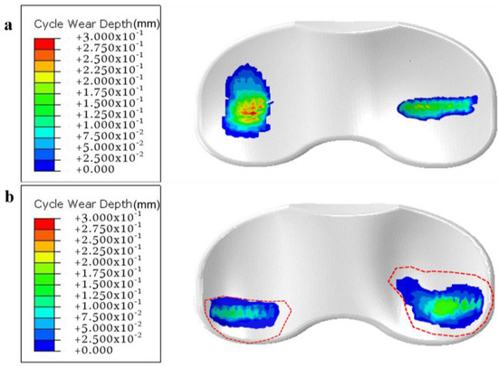 Computational wear contour after 5 million cycles: (a) initial model; (b) optimal model.