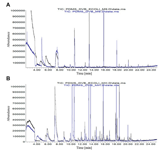Comparison of overlaid gas chromatography–mass spectrometry (GC-MS) chromatograms obtained for (A) E.coli bacterium + M9 medium (black) versus pure M9 medium (blue) and (B) E.coli bacterium + Mueller Hinton (MH) medium (black) versus pure MH medium (blue).