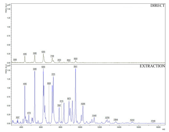 Representative (from triplicate experiment) matrix-assisted laser desorption/ionization–time-of-flight mass spectrometry (MALDI-TOF MS) spectra of E. coli in MH medium obtained using the “DIRECT” and “EXTRACTION” procedure.