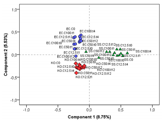 Figure 3 presents the PCA score plot obtained for different protein ions profiles acquired under the mentioned experimental conditions, for each bacterial strain. Profiles belonging to an individual bacterial strain were clearly separated from others, highlighting the discriminative power of ribosomal profiles in bacteria identity. However, still being possible to observe that the performed assays were capable of significantly altering such profiles, in this case, the distinction between the 3 strains was explained by only 14% of the variance.