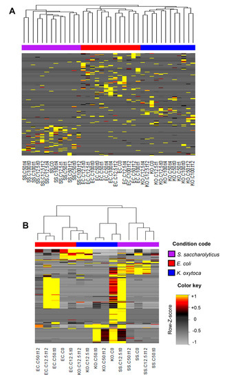 Heatmaps referring to protein ions profiles (Figure 4A) and VOC profiles (Figure 4B) allow inspection of the distribution of ions detected in each experiment. Hierarchical cluster analysis evidencing the similarity between these individual profiles and segregation according to bacterial strain were observed in data extracted both by MALDI-TOF MS and GC-MS results. The ions constituting the profiles were grouped in clusters, which correspond to the main distribution behaviors identified along the samples.