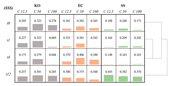 Matrix presenting average values of spectra similarity score (SSS), concerning comparison between unstressed spectrum and assays using silver nanoparticles (AgNPs) at 12.5, 50, and 100 µg mL−1, for periods of time 0, 1, 4, and 12 h. Gray, orange, and green bars refer to K. oxytoca (KO), S. saccharolyticus (SS), and E. coli (EC), respectively; C—concentration (µg mL−1); t—time (h).