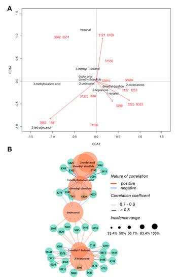 (A) Canonical correlation analysis (CCA) biplot showing the correspondence of the main protein ions (red) with emitted VOCs (black), where CCA1 = 22.43% and CCA2 = 15.28%; (B) Correlation network depicting main relevant connections (rho ≥ [0.7]) between MALDI-TOF MS ions and identified volatiles.