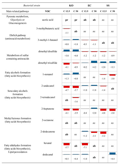 Combination of charts showing altered VOCs and addressed bacterial metabolic pathways, where numbers inside boxes display the base 2 logarithm of fold-change calculated with respect to the response in untreated strain; pr = produced only after AgNPs addition, ab = absent after AgNPs addition, ns = not significant alteration (p > 0.05), KO—K. oxytoca, EC—E. coli, SS—S. saccharolyticus, C—concentration (µg mL−1), VOC—volatile organic compound [61].