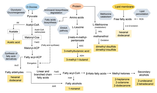 Scheme showing main pathways related to volatile organic metabolites which presented relevant alterations in their responses due to nanoparticles supplementation (AK—acetate kinase; KDC—2-keto acid decarboxylase; ADH—alcohol dehydrogenase; FAR—fatty acid reductase; FabD—malonyl-CoA:ACP transacylase; FadD—fatty acyl-CoA synthase; AhR—aryl hydrocarbon receptor; Acr2—acyl-CoA reductase; MGL—methionine-γ-lyase; ROS—reactive oxygen species).