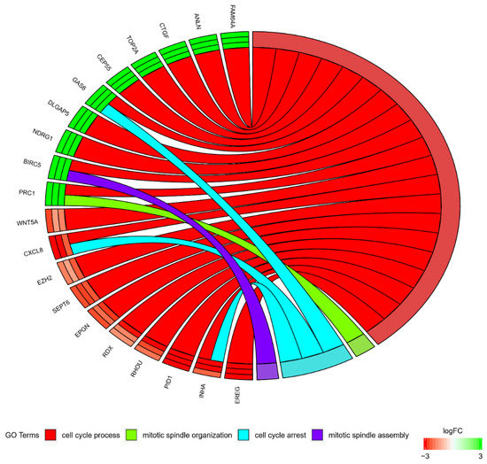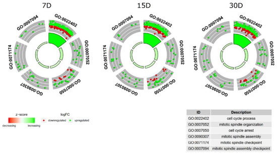 A representation of the mutual relationship between the 20 chosen genes that belonged to the “cell cycle arrest”, “cell cycle process”, “mitotic spindle assembly checkpoint”, “mitotic spindle assembly”, “mitotic spindle checkpoint”, and “mitotic spindle organization” GO BP terms. The ribbons indicate which gene belongs to which category. The colors of the three inner bars near each gene correspond to the logFC after 7, 15, and 30 days. The genes were sorted by logFC.