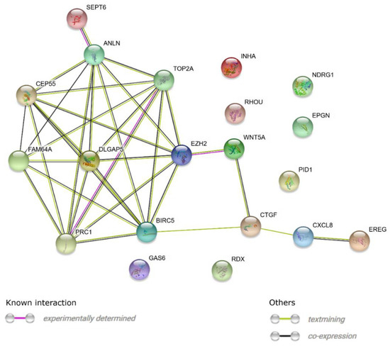 A transcriptomic analysis of proliferating GCs was the main goal of this study. Human GCs undergoing mitotic division showed differentially expressed genes belonging to the “cell cycle arrest”, “cell cycle process”, “mitotic spindle organization”, “mitotic spindle assembly checkpoint”, “mitotic spindle assembly”, and “mitotic spindle checkpoint” GOs during long-term primary culture conducted in in vitro conditions. The obtained results indicate the key role of these genes during granulosa cell division processes. In our research, special attention was paid to two groups of genes. The first of them included genes belonging to “cell cycle arrest” and “cell cycle process”, which are responsible for the regulation of the cell cycle by restricting the progression of the cell cycle during one of its four phases: G1, S, G2, or M. The second class of genes, which contained members of the other four analyzed ontological groups, consisted of genes taking part in the organization and arrangement of the karyokinetic spindle structure during mitosis. During our study, among the members of the gene ontologies of interest, we chose the 10 most upregulated and 10 most downregulated genes. In the course of conducting the analyses, it was found that an increase in gene expression was particularly observed in the “cell cycle arrest” and “cell cycle process” ontology groups. The genes with the most increased expression were FAM64A, ANLN, TOP2A, CTGF, CEP55, BIRC5, PRC1, DLGAP5, GAS6, and NDRG1; while EREG, PID1, INHA, RHOU, CXCL8, SEPT6, EPGN, RDX, WNT5A, and EZH2 were the most downregulated during the time of the culture. While most of the microarray results were validated using RT-qPCR, it needs to be noted that EPGN showed an opposite pattern of expression across all of the culture periods, while INHA exhibited a reversed expression pattern in the first analyzed period of the culture. In these cases, as RT-qPCR is considered to be more quantitatively accurate, the results of the validation were considered in the discussion. The interactions and relations of these genes are presented in Figure 2, Figure 3, and Figure 5. Some of the genes of interest represented more than one ontology groups (Figure 4). All of them belonged to the “cell cycle process” ontology group.