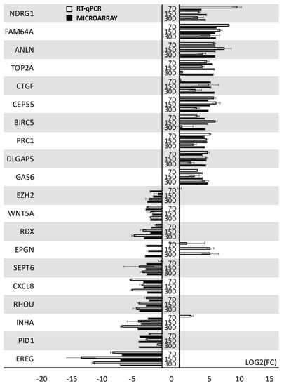 The results of the RT-qPCR validation of expression microarrays (log (FC)), presented as a bar graph. Error bars represent the standard error of the mean (SEM; n = 3). All of the presented sample means were deemed to be statistically significant (p < 0.05). D: day of culture; FC: fold change.