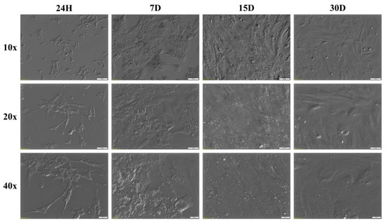 Change in granulosa cell (GC) morphology during long-term in vitro primary culture. 24H: first day of culture; D: day of culture; 10×, 20×, 40×: magnification.