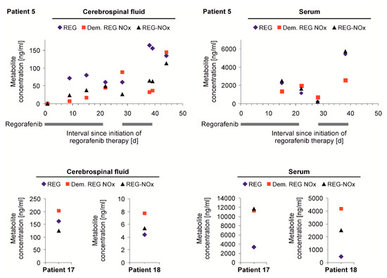 We collected CSF and serum samples from 3 patients (patients 5, 17, and 18) and REG and its active metabolites were detectable in both serum and CSF. Levels of REG and its metabolites were approximately by a factor between 4 and 540 higher in serum than in CSF. Because patient 5 required repeated punctures of the Rickham reservoir due to occlusive hydrocephalus (Figure S2), CFS levels could be monitored over time (Figure 1). CSF was collected before (n = 3) and after initiation of REG treatment (n = 8). REG and its metabolites were not detectable in the first CSF sample that was obtained only 3 h after the first administration of REG (no serum sample was available for this time point). There was a trend towards higher metabolite concentrations in the second REG cycle (Figure 1) that had to be terminated prematurely due to clinical deterioration. CSF from patients 17 and 18 was obtained by lumbar puncture after initiation of REG. While REG itself was the dominating metabolite in the CSF of patient 5 in 5 of 7 samples, demethylated N-oxide was the most prevalent metabolite in the other 2 patients (Figure 1). Lumbar puncture of patient 18 was performed 2 days after the last REG intake which most likely is the cause for the comparatively low concentrations. In all available serum samples, the REG metabolites were usually more prevalent than REG itself.