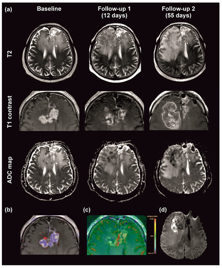 - Ellingson, B.M.; Bendszus, M.; Boxerman, J.; Barboriak, D.; Erickson, B.J.; Smits, M.; Nelson, S.J.; Gerstner, E.; Alexander, B.; Goldmacher, G.; et al. Consensus recommendations for a standardized Brain Tumor Imaging Protocol in clinical trials. Neuro-Oncology 2015, 17, 1188–1198. [Google Scholar]